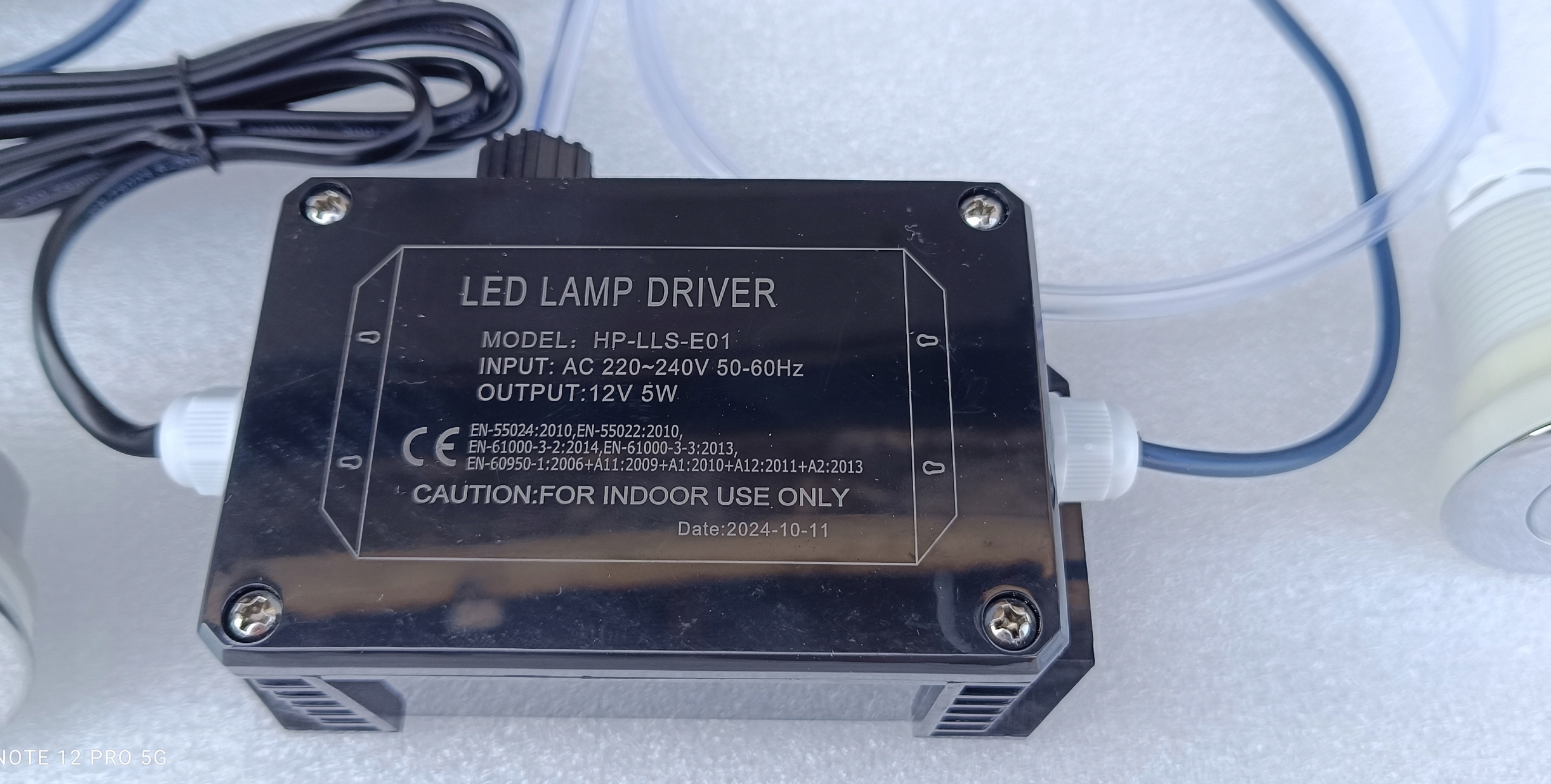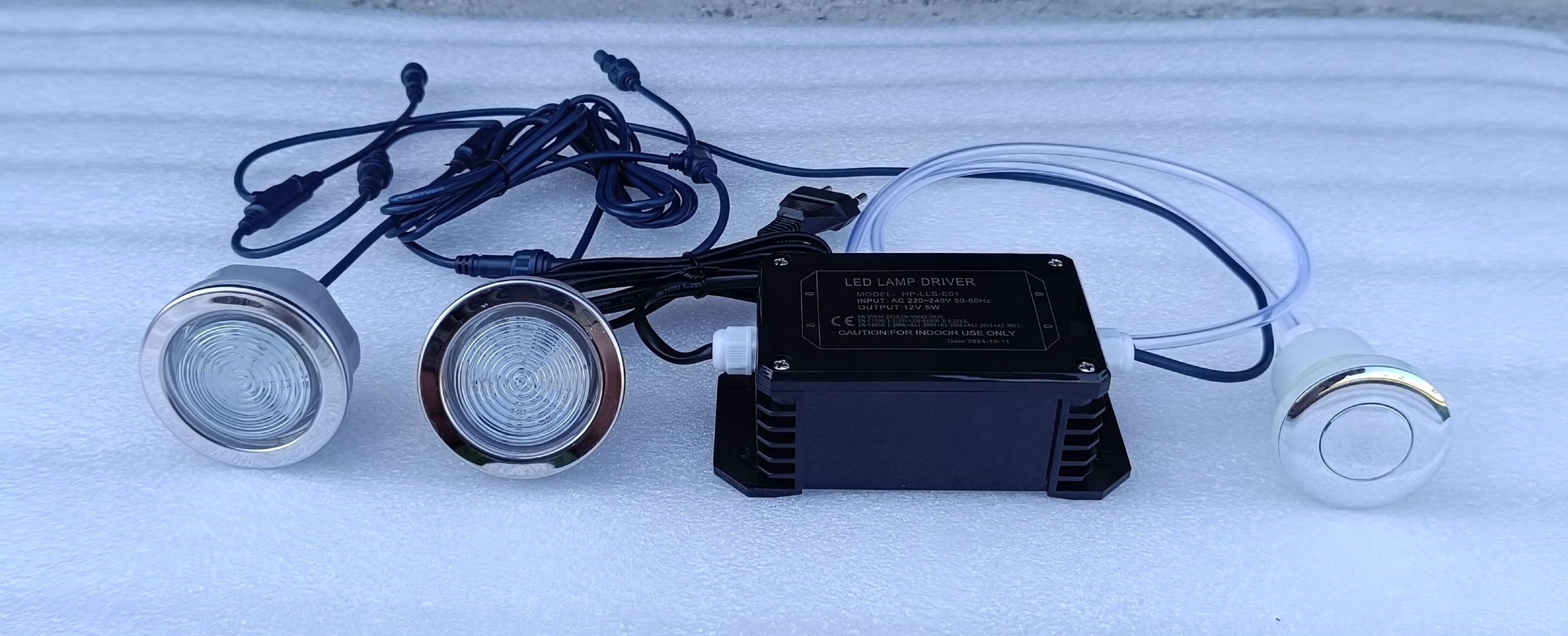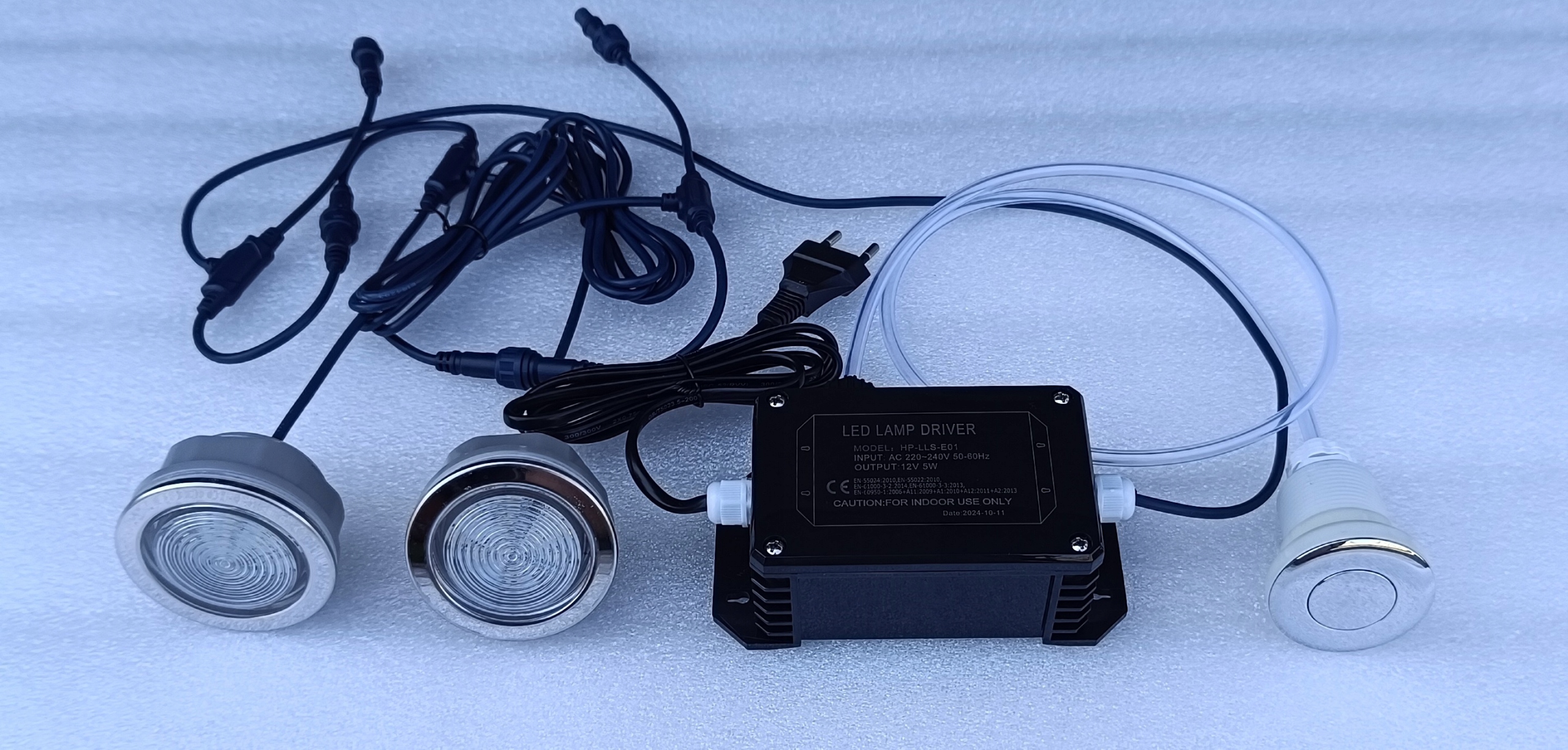 Zestaw 2 świateł LED + sterownik + przycisk pneumatyczny + wężyk + podkładka ze stali nierdzewnej pod przycisk pneumatyczny z oznaczeniem LED