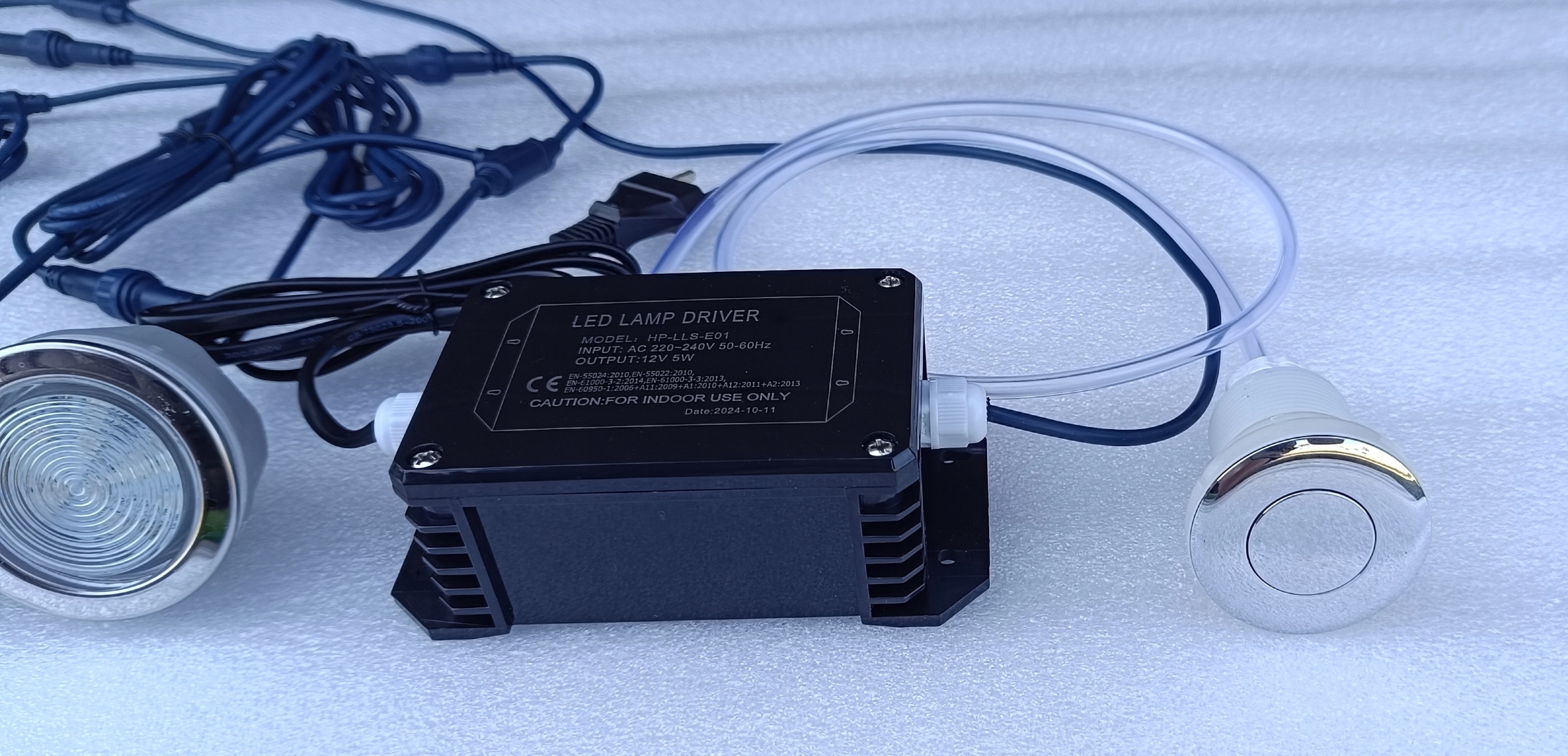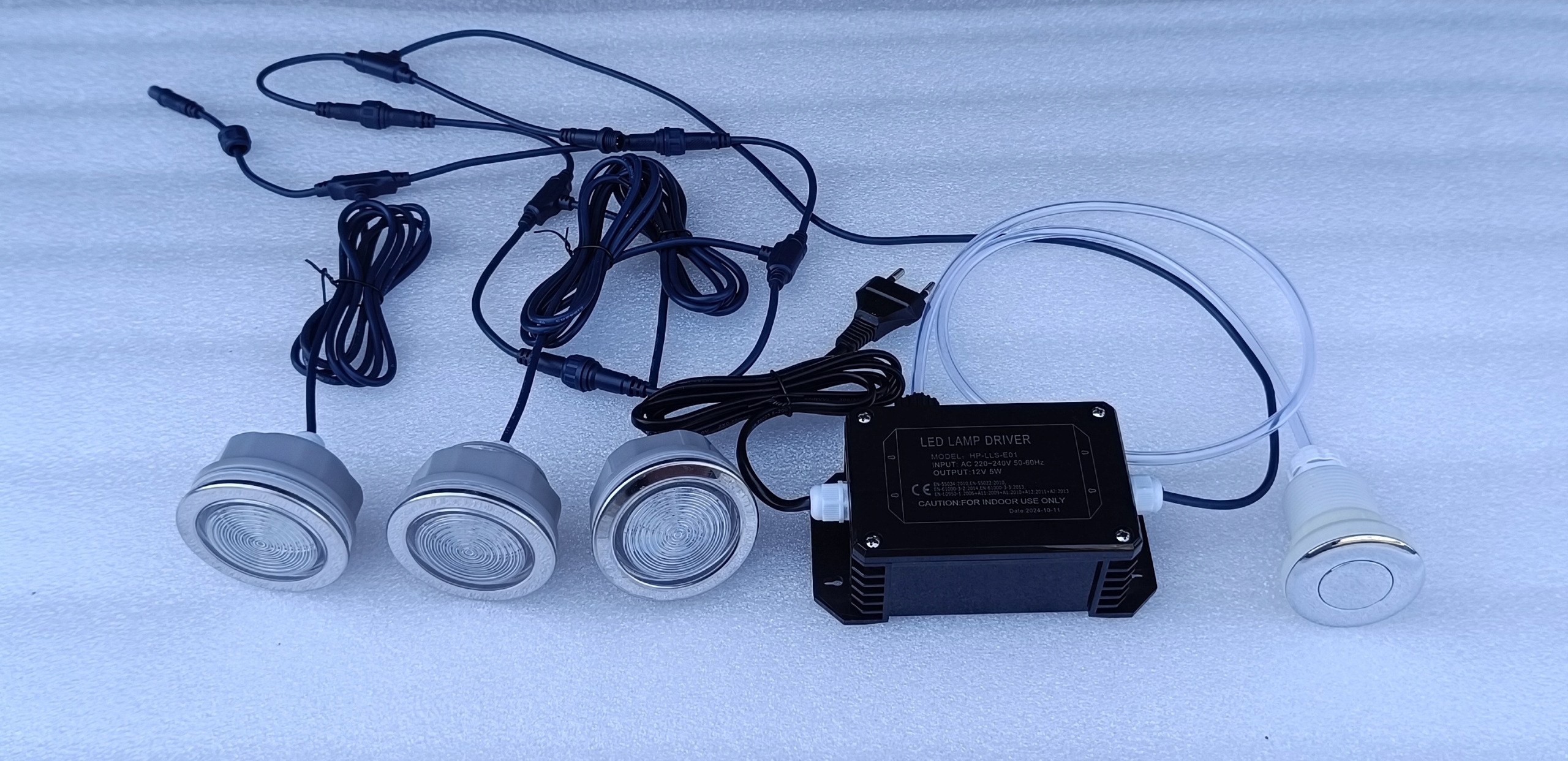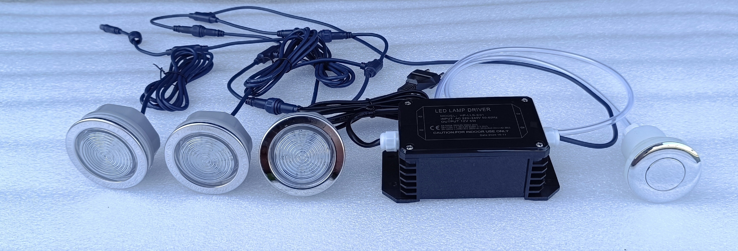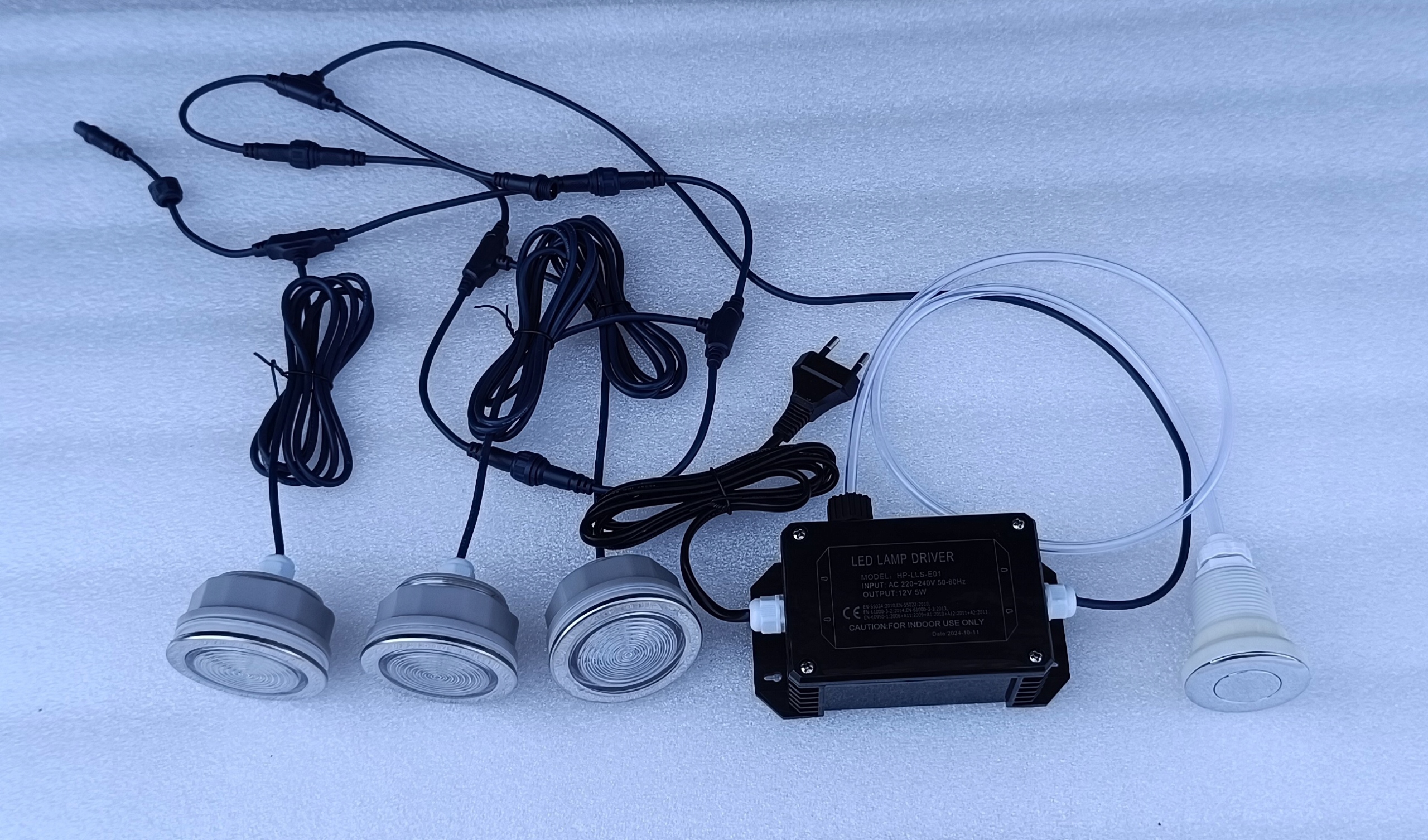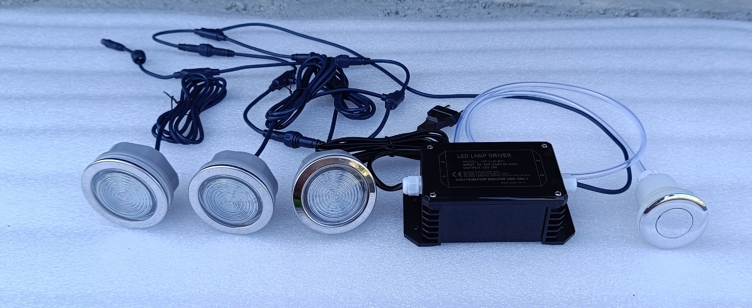Zestaw 3 świateł LED + sterownik + przycisk pneumatyczny + wężyk + podkładka ze stali nierdzewnej pod przycisk pneumatyczny z oznaczeniem LED