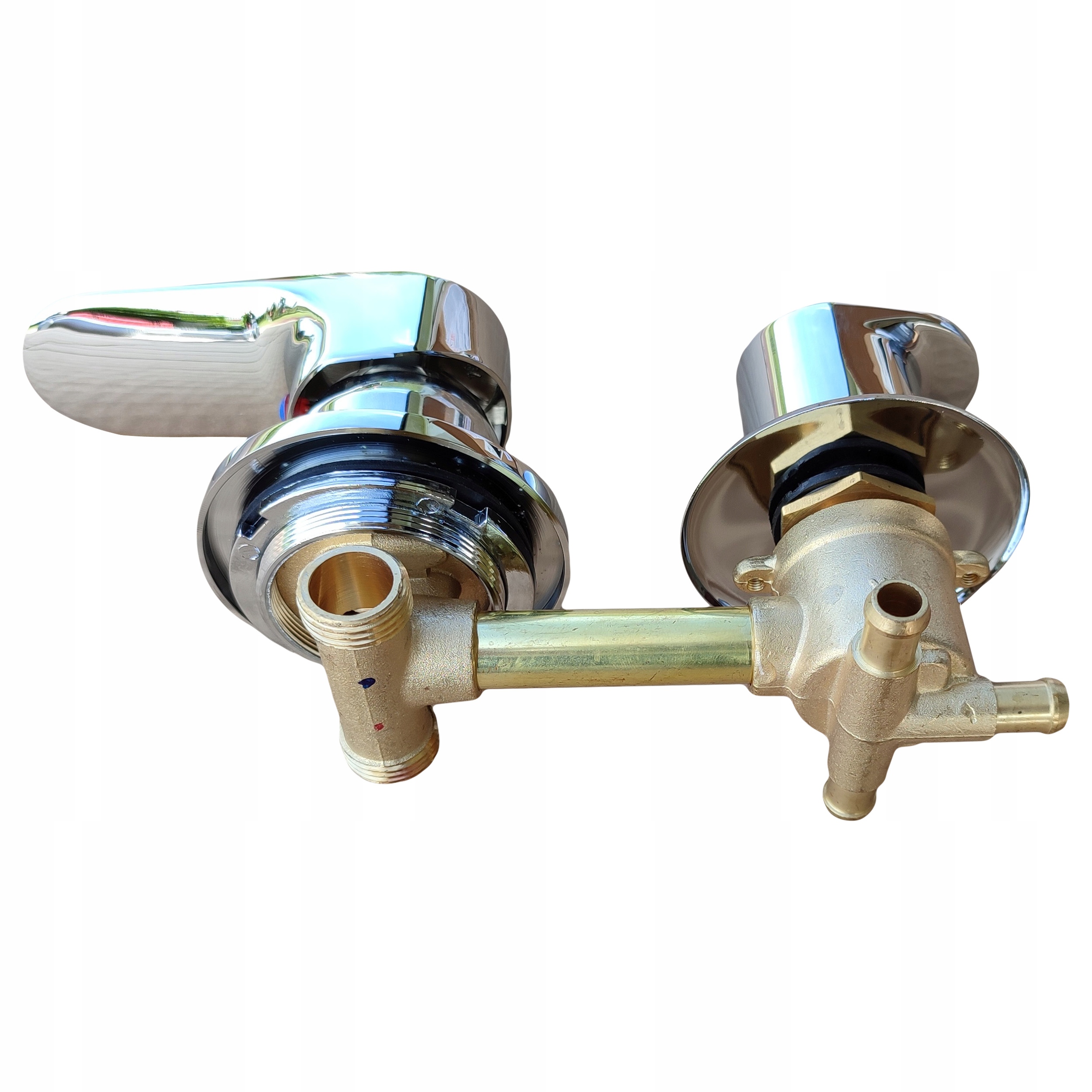 Solidna, mosiężna bateria do kabiny prysznicowej z hydromasażem / paneli prysznicowych i natryskowych posiadająca z jednej strony podłączenia do zimnej oraz ciepłej wody na wężyki 1/2″ (mieszacz) a z drugiej strony na 3 funkcje / źródła natrysku na obejmy zaciskowe (rozdzielacz funkcji) jak np. na: