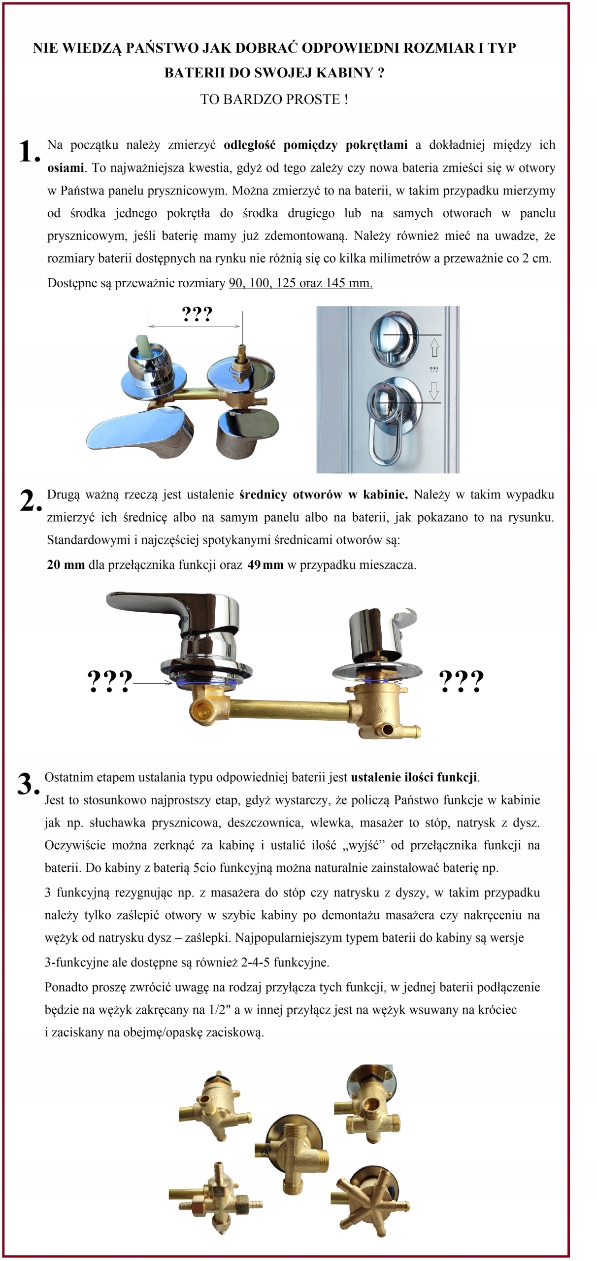 Rozmiar baterii – 90 mm (jest to rozstaw od środka jednego otworu montażowego (od mieszacza) do środka drugiego otworu montażowego (od przełącznika funkcji))