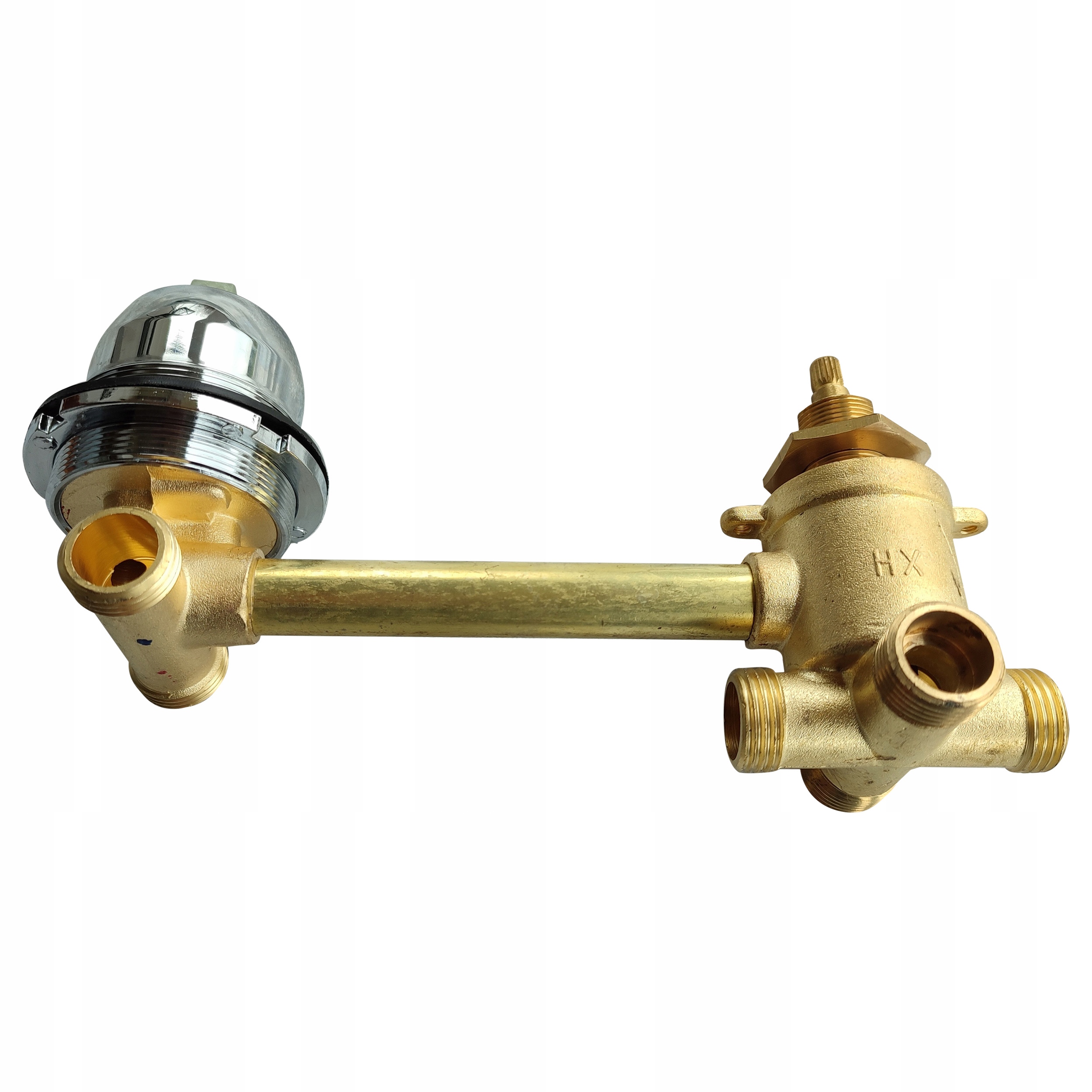 Solidna, mosiężna bateria do kabiny prysznicowej z hydromasażem / paneli prysznicowych i natryskowych posiadająca z jednej strony podłączenia do zimnej oraz ciepłej wody na wężyki 1/2″ (mieszacz) a z drugiej strony na 3 funkcje / źródła natrysku na obejmy zaciskowe (rozdzielacz funkcji) jak np. na: