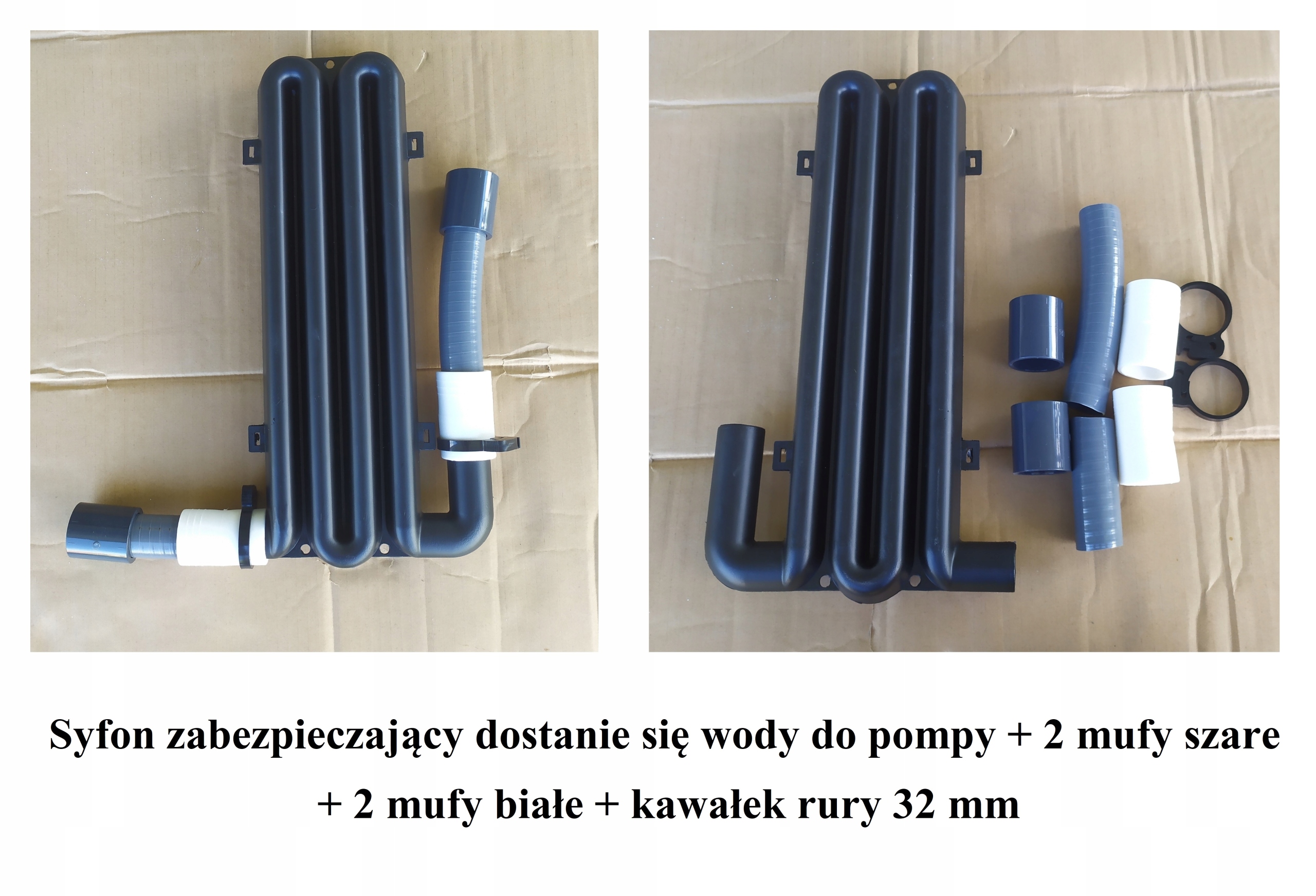 7. Syfon zabezpieczający dostanie się wody do pompy + 2 mufy szare + 2 mufy białe + kawałek rury 32 mm + 2 zaciski x 1 kpl