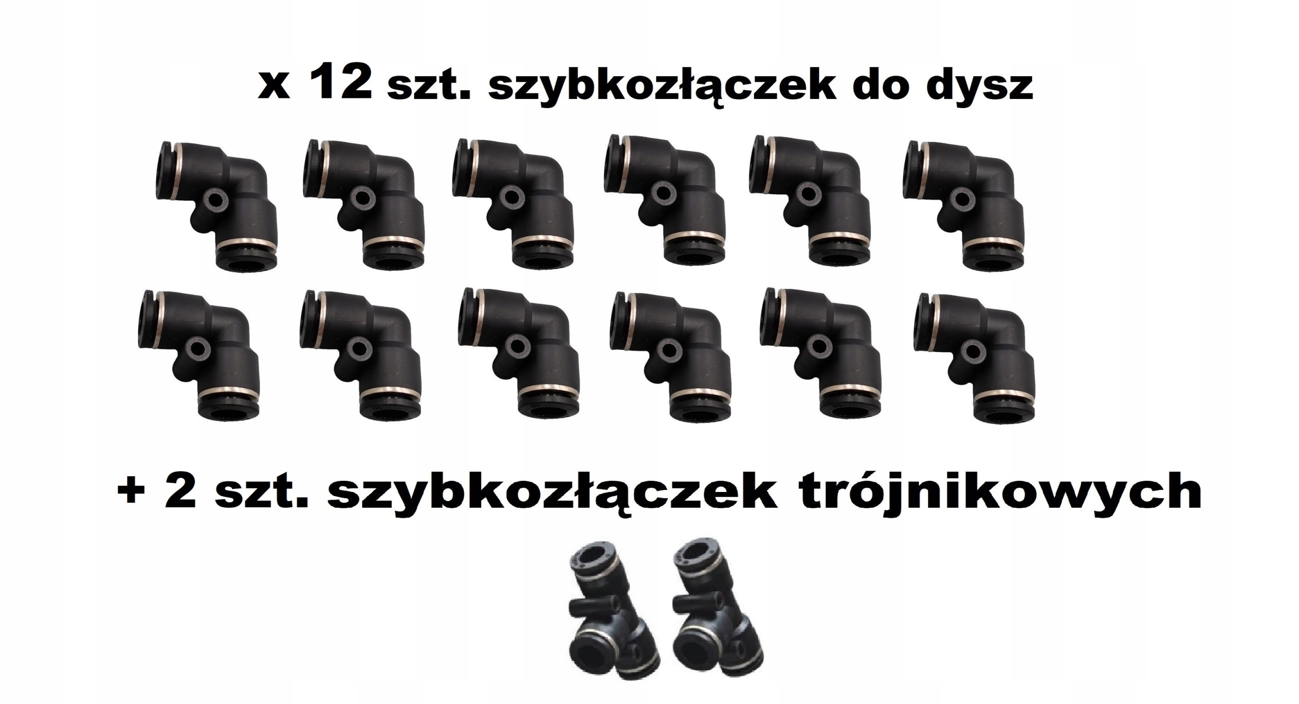 12 x Szybkozłączek kolankowych do rozdzielacza dysz powietrza + 2 szt. szybkozłączki trójnikowe = całość na 14 dysz