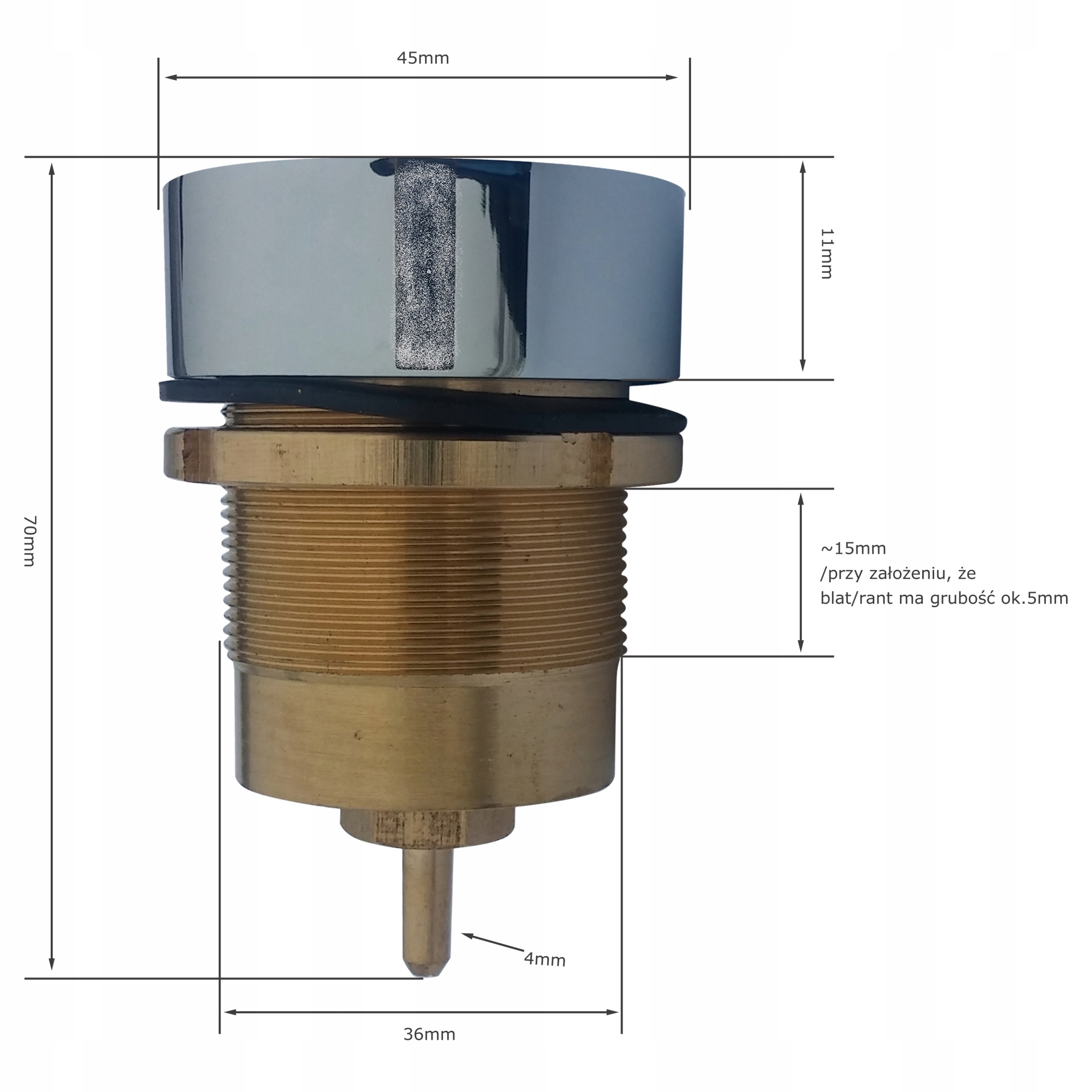 Średnica na gwincie: 36 mm (min. otwór w wannie, blacie itp)