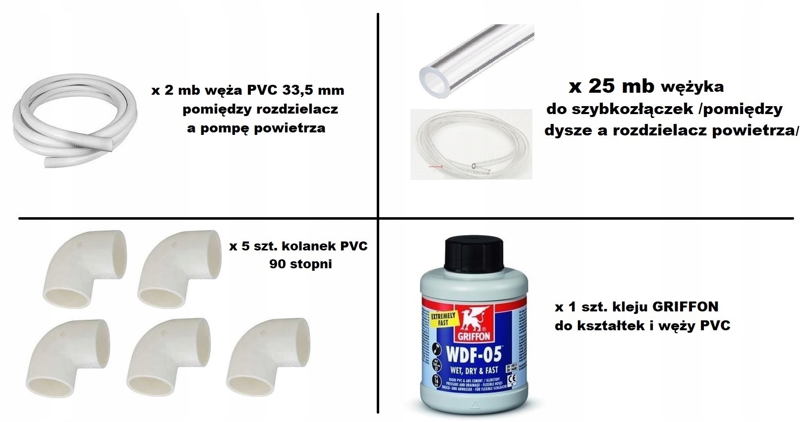Jako jedyni w zestawie oferujemy 2 metry bieżące rury giętkiej PVC, potrzebna kilka kawałków rury, od pompy do zaworu zwrotnego, od zwrotnego do syfonu, od syfonu do kolejnego zaworu zwrotnego od zwrotnego do rozdzielacza