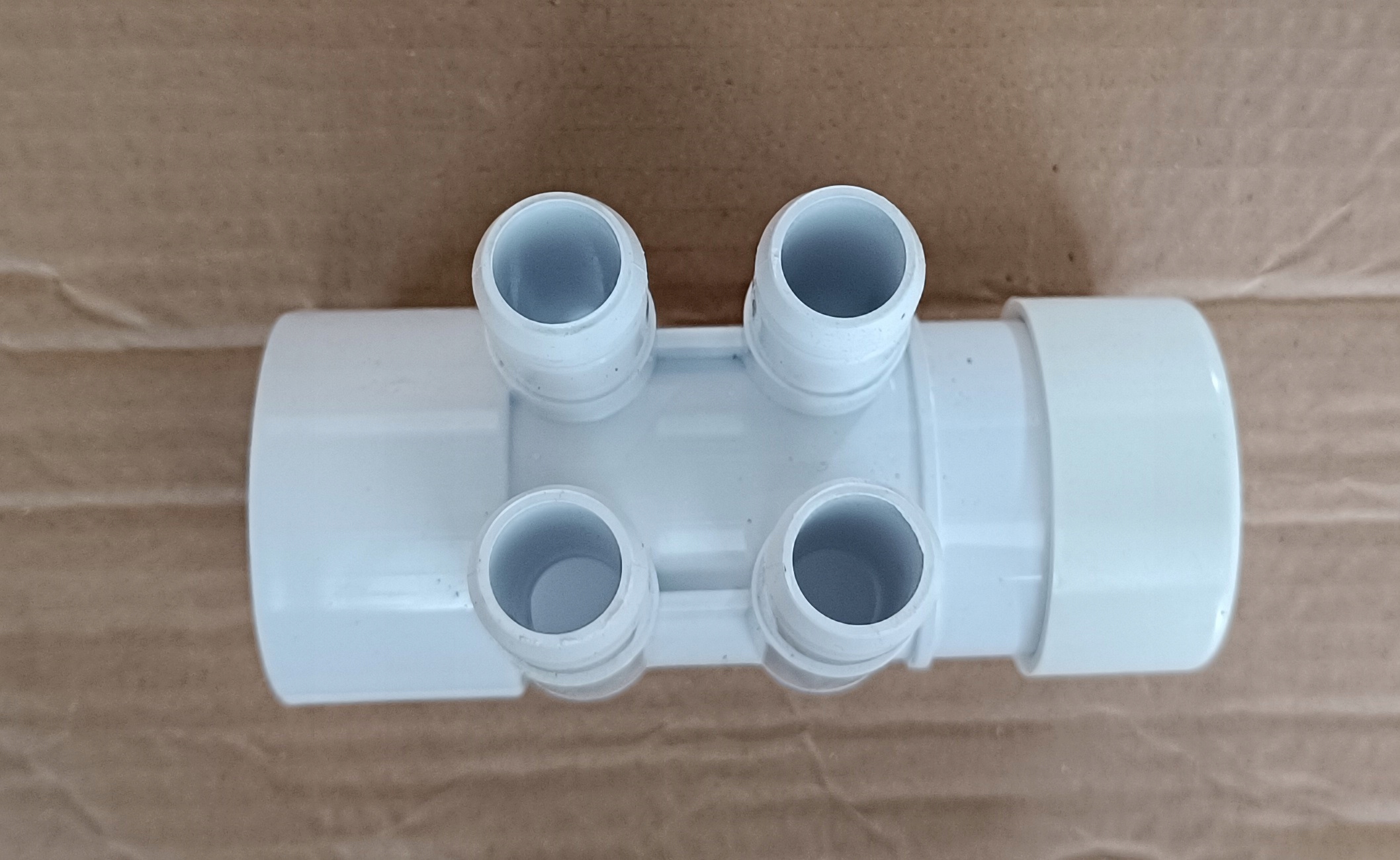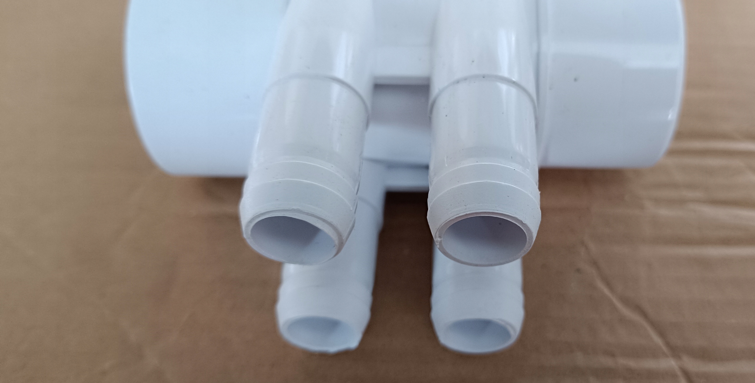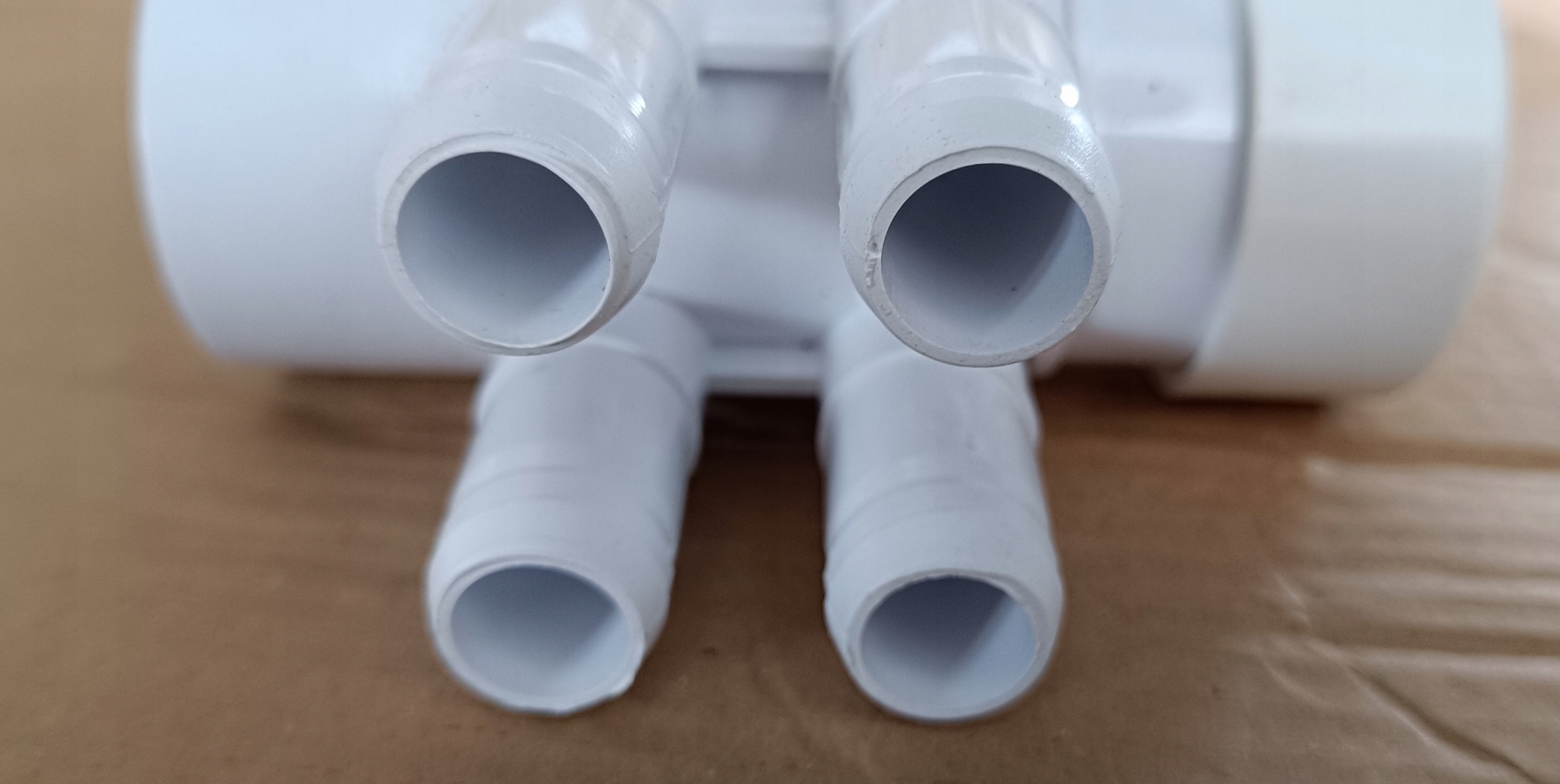 Rozdzielacze można swobodnie łączyć ze sobą, jeden wchodzi w drugi, w razie konieczności rozdzielenia powietrza z dmuchawy na 8-12 dysz potrzebne są 2-3 rozdzielacze, które klei się klejem do PVC