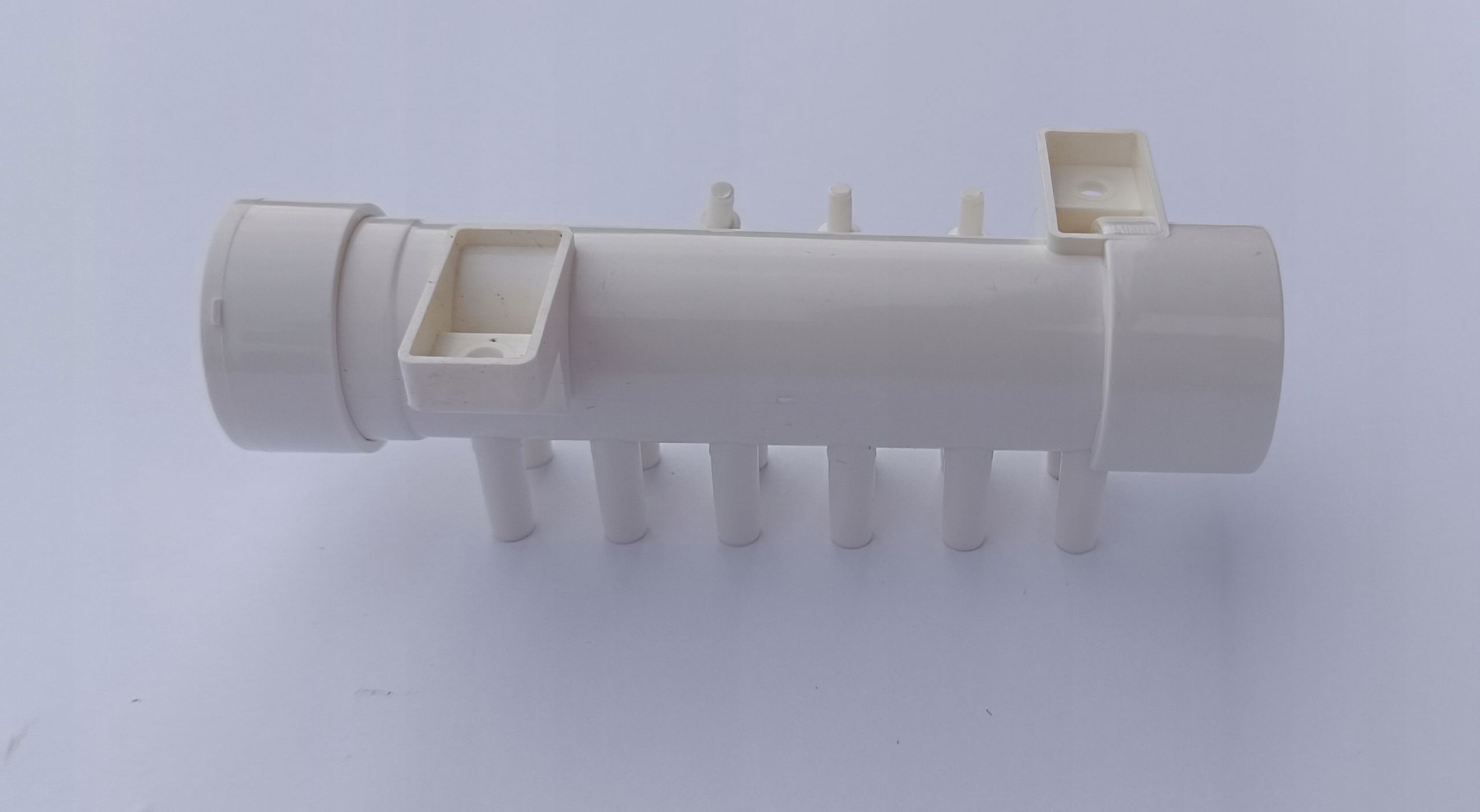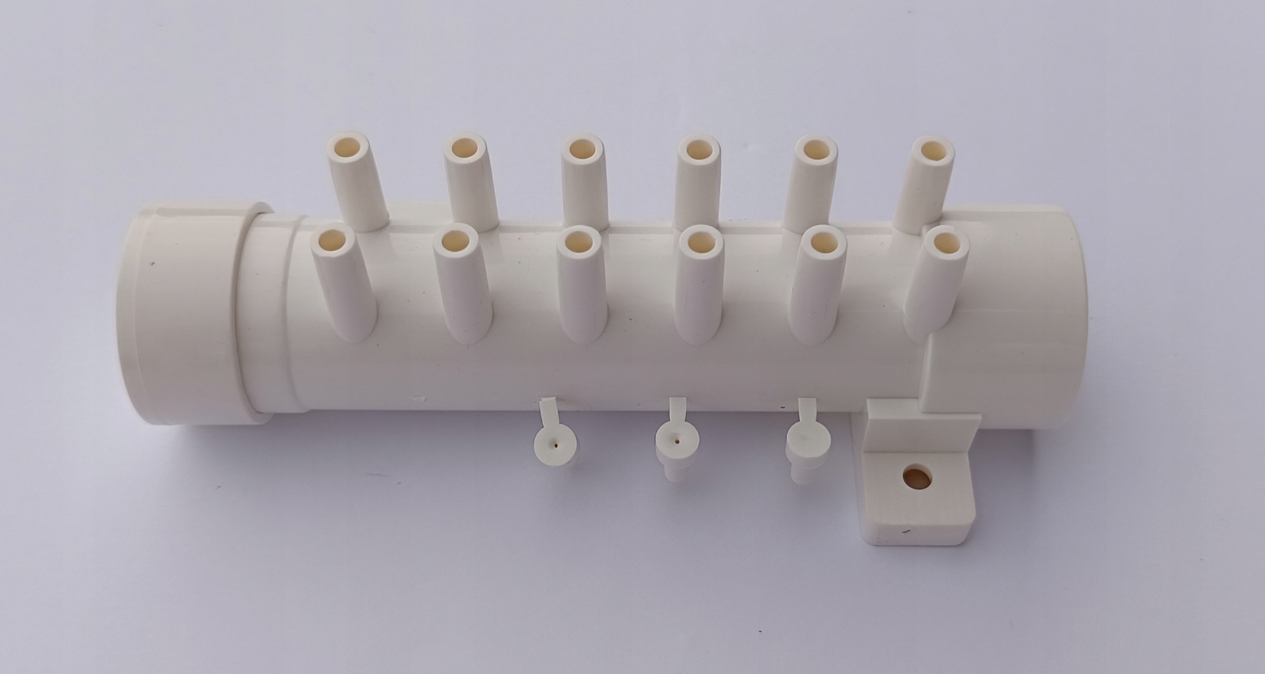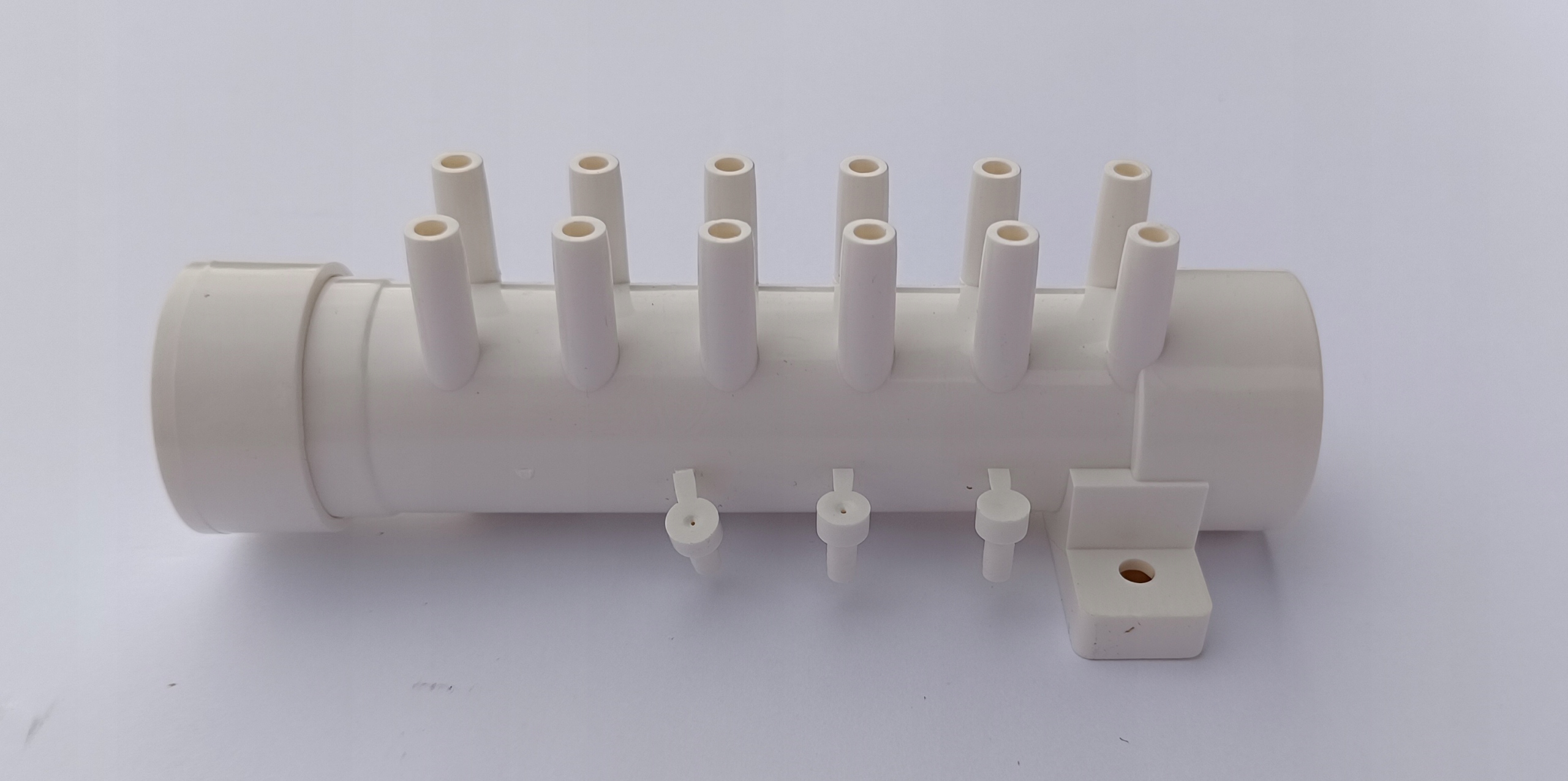 Rozdzielacze można swobodnie łączyć ze sobą, jeden wchodzi w drugi, w razie konieczności rozdzielenia powietrza z dmuchawy na 24 dysze potrzebne będą 2 rozdzielacze, które klei się klejem do PVC