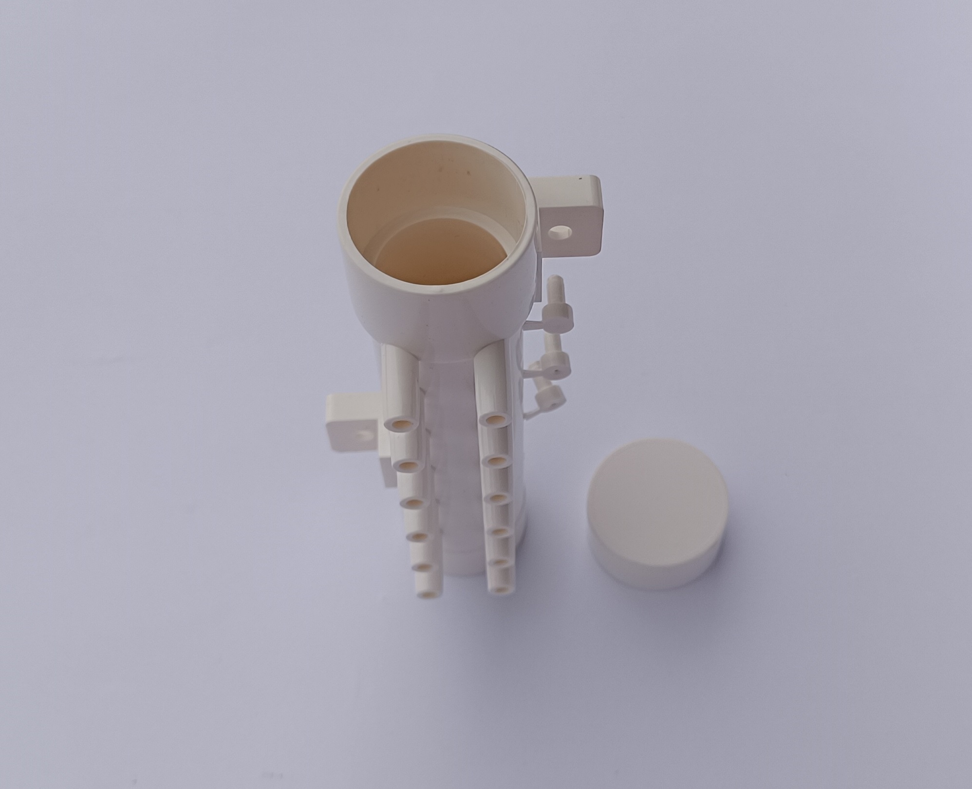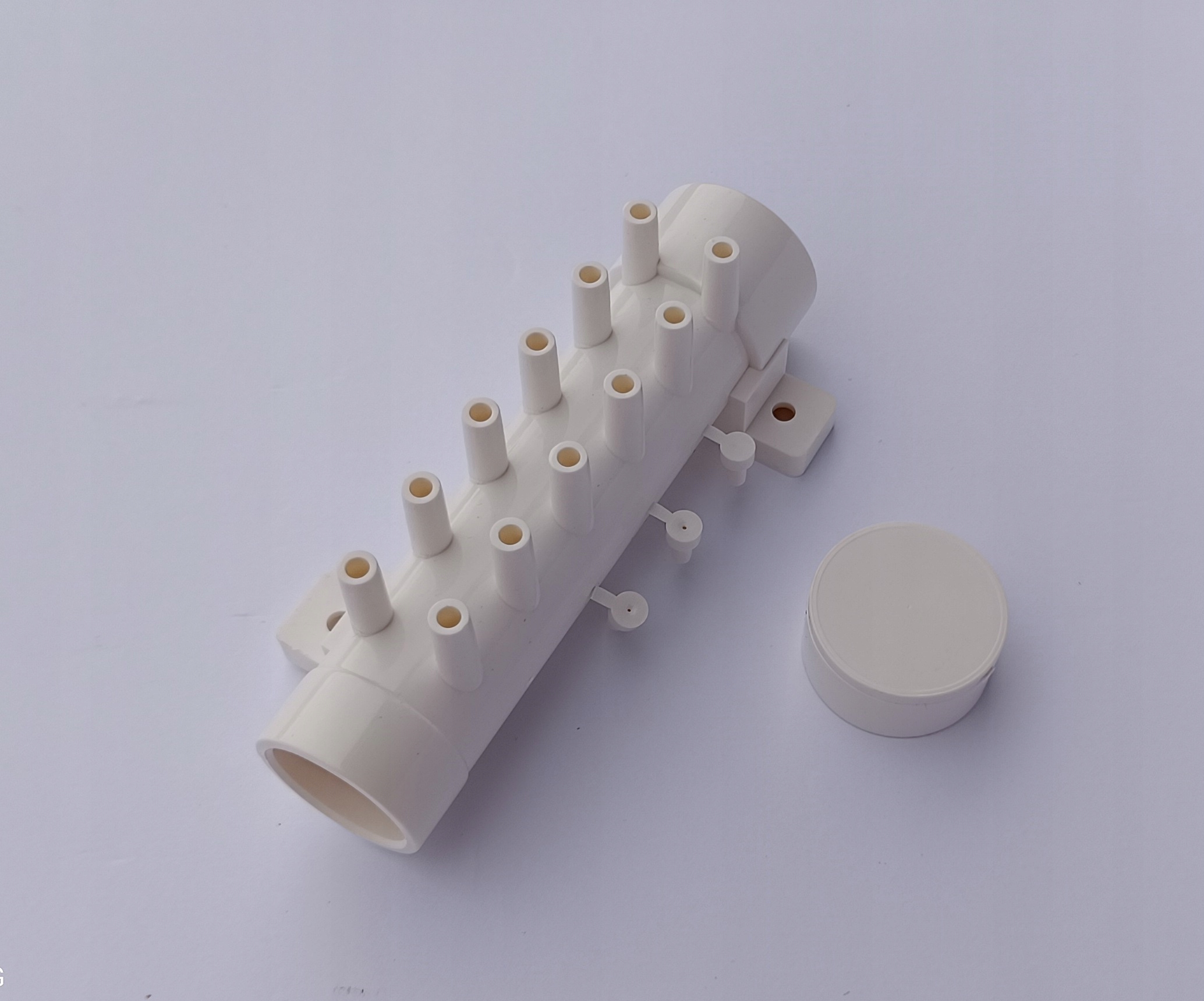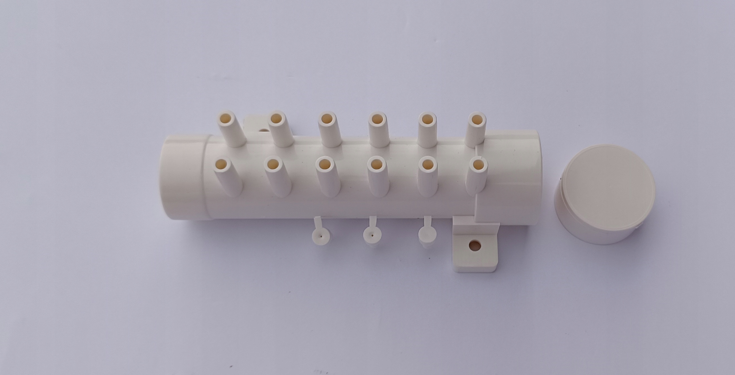 Rozdzielacze można swobodnie łączyć ze sobą, jeden wchodzi w drugi, w razie konieczności rozdzielenia powietrza z dmuchawy na 24 dysze potrzebne będą 2 rozdzielacze, które klei się klejem do PVC