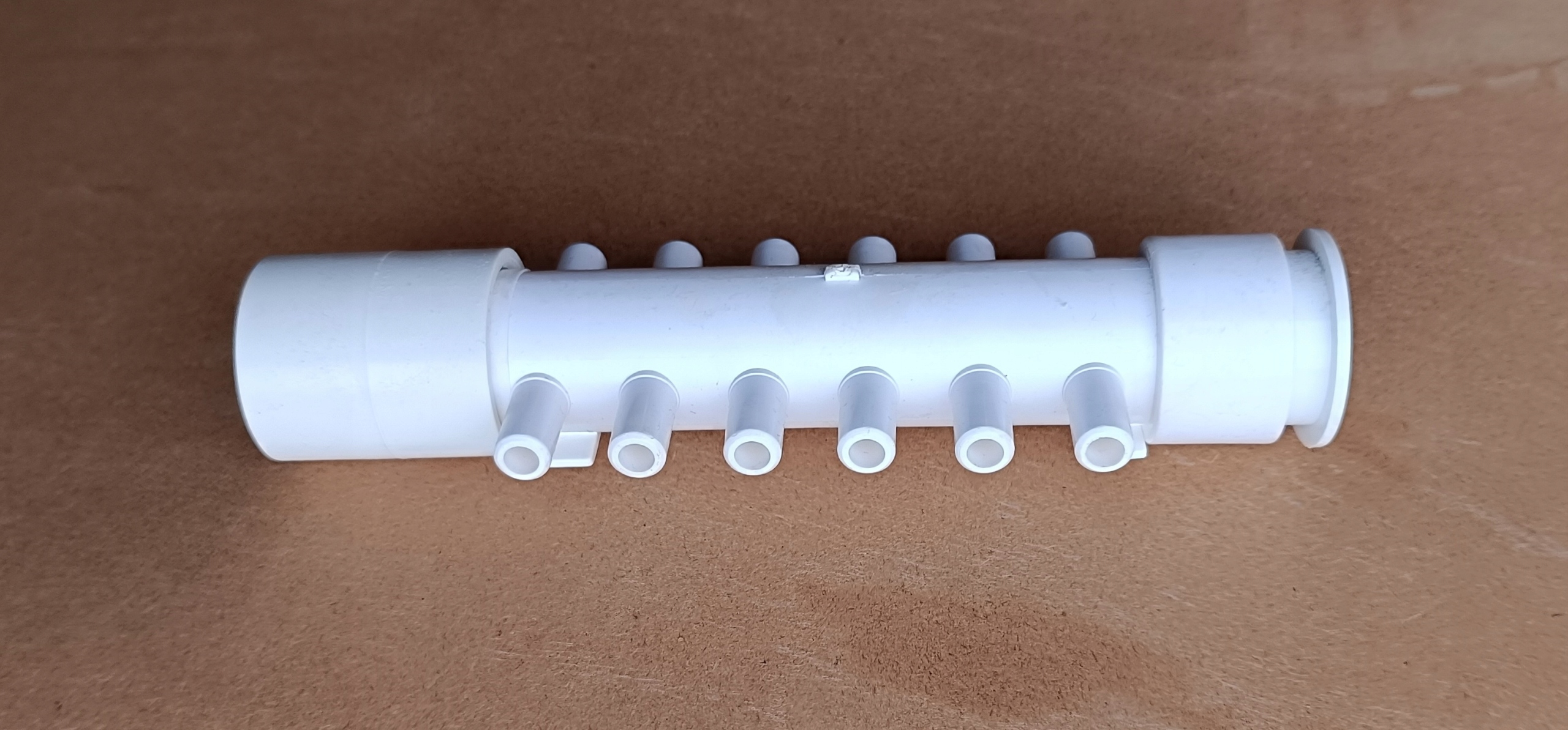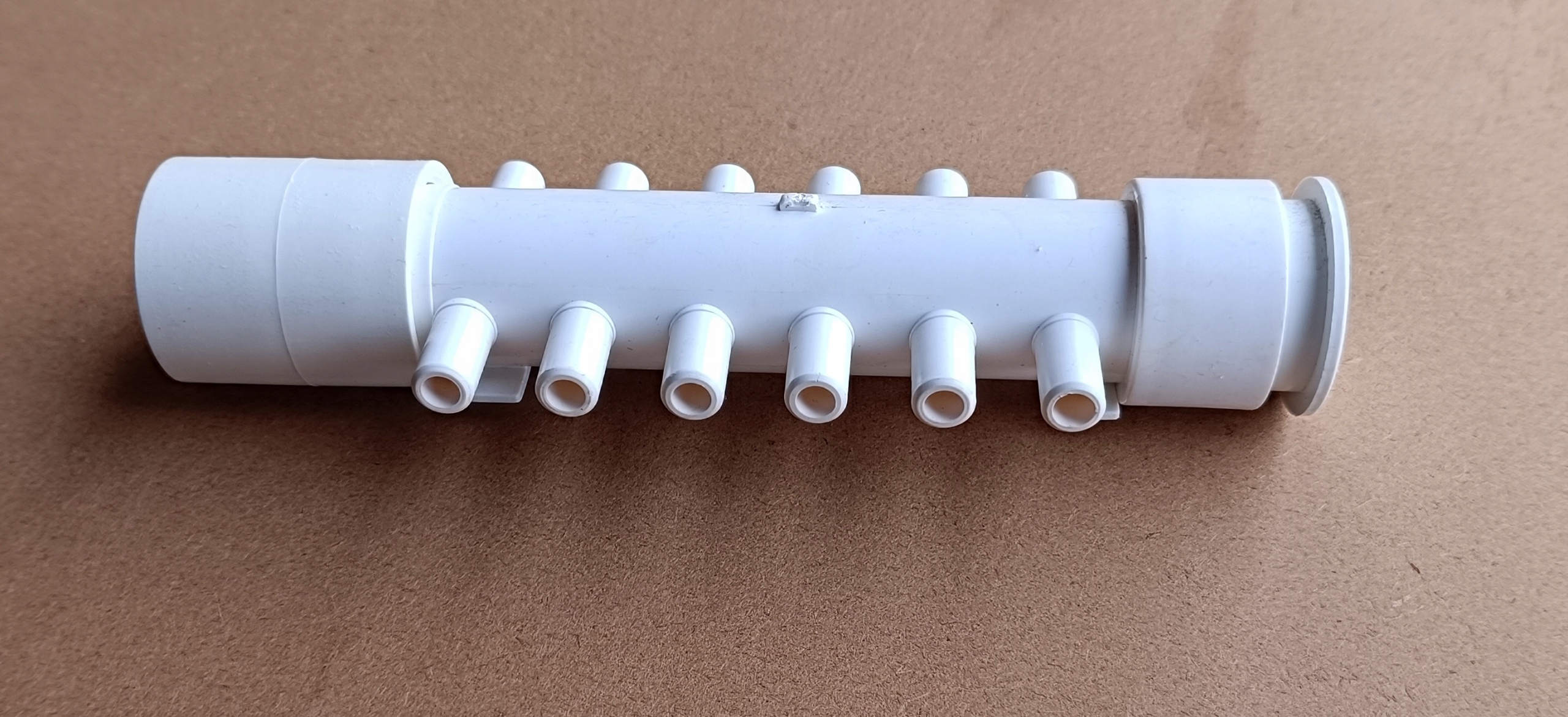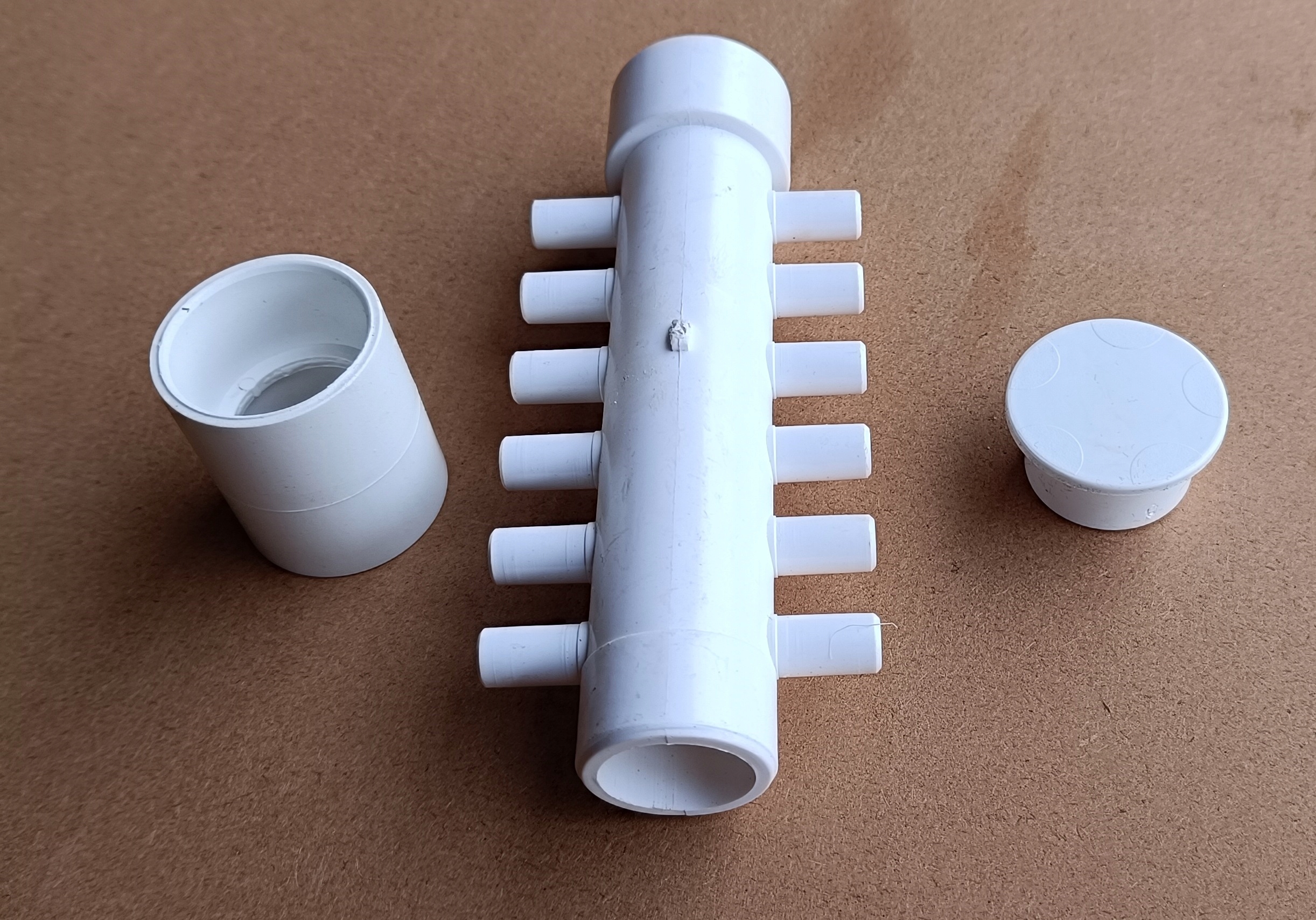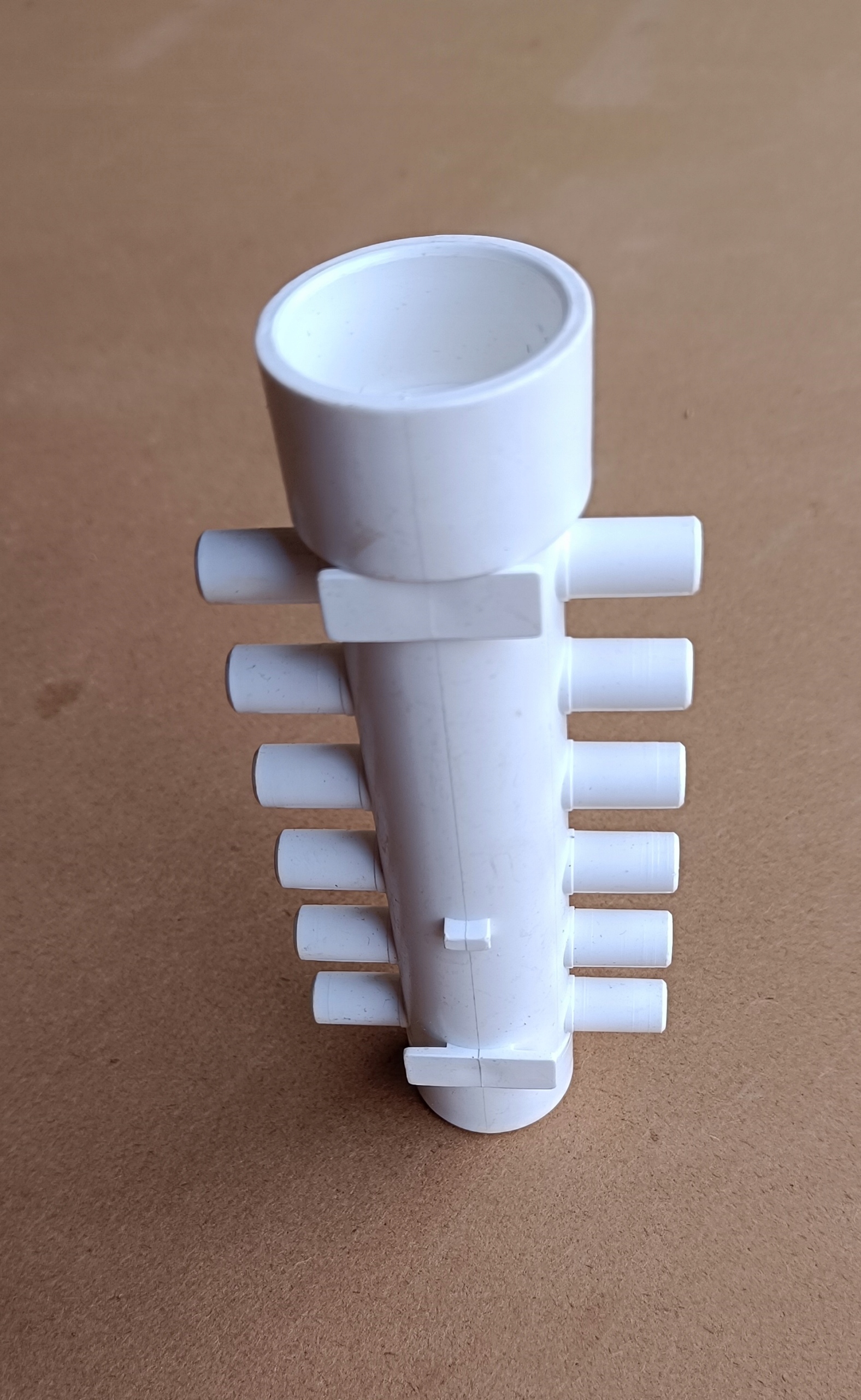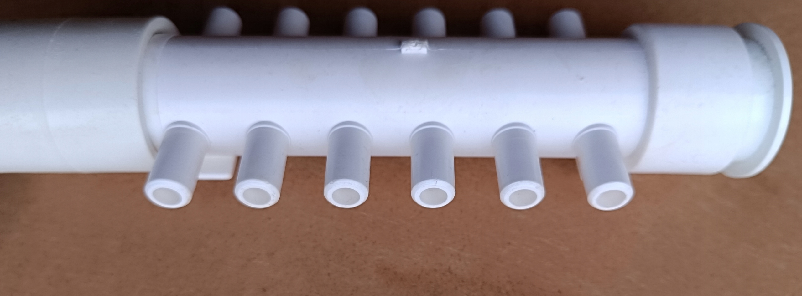 Rozdzielacze można swobodnie łączyć ze sobą, jeden wchodzi w drugi, w razie konieczności rozdzielenia powietrza z dmuchawy na 24 dysze potrzebne będą 2 rozdzielacze, które klei się klejem do PVC