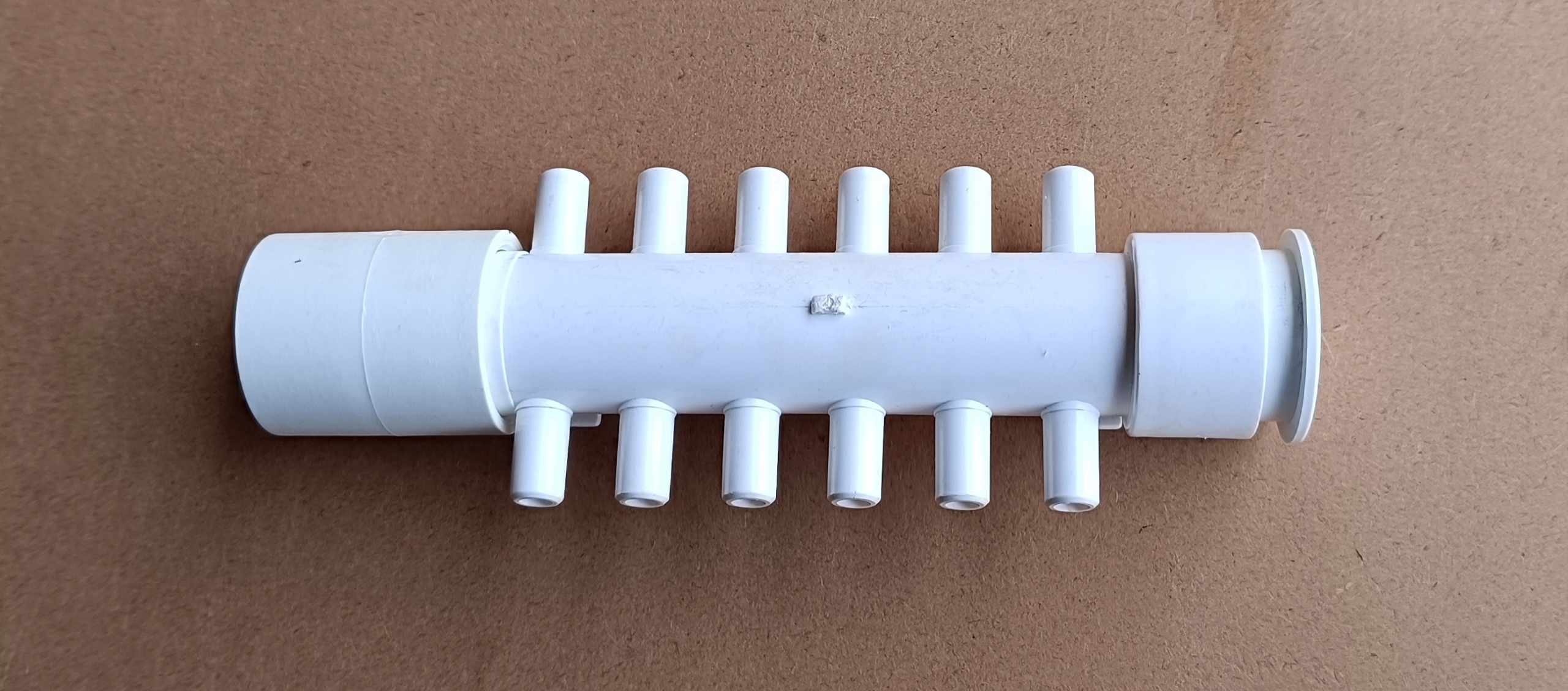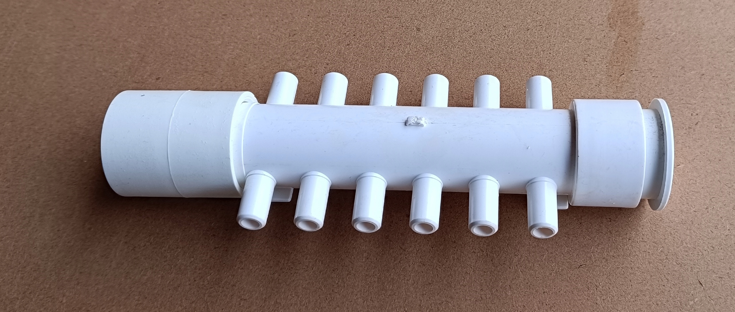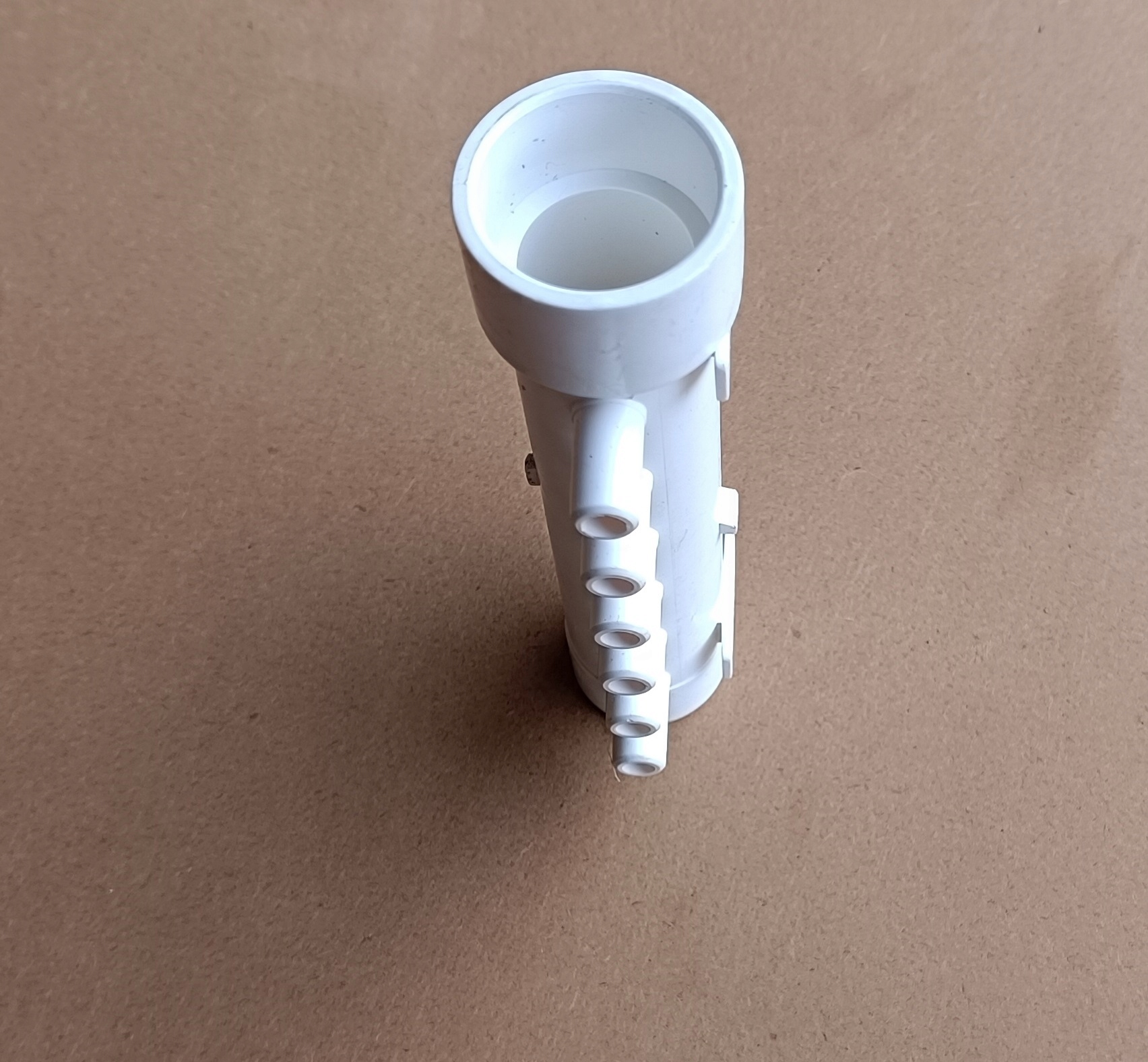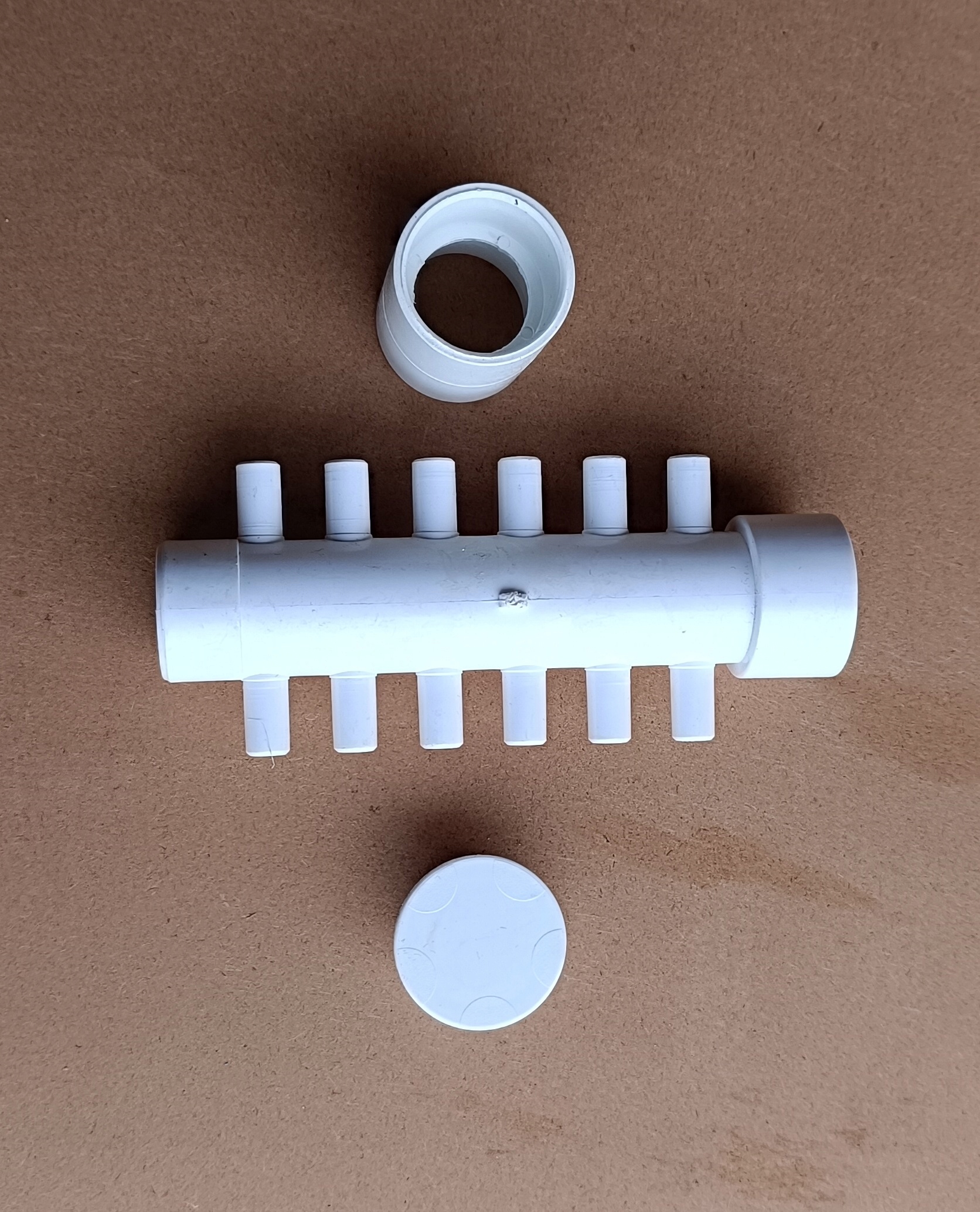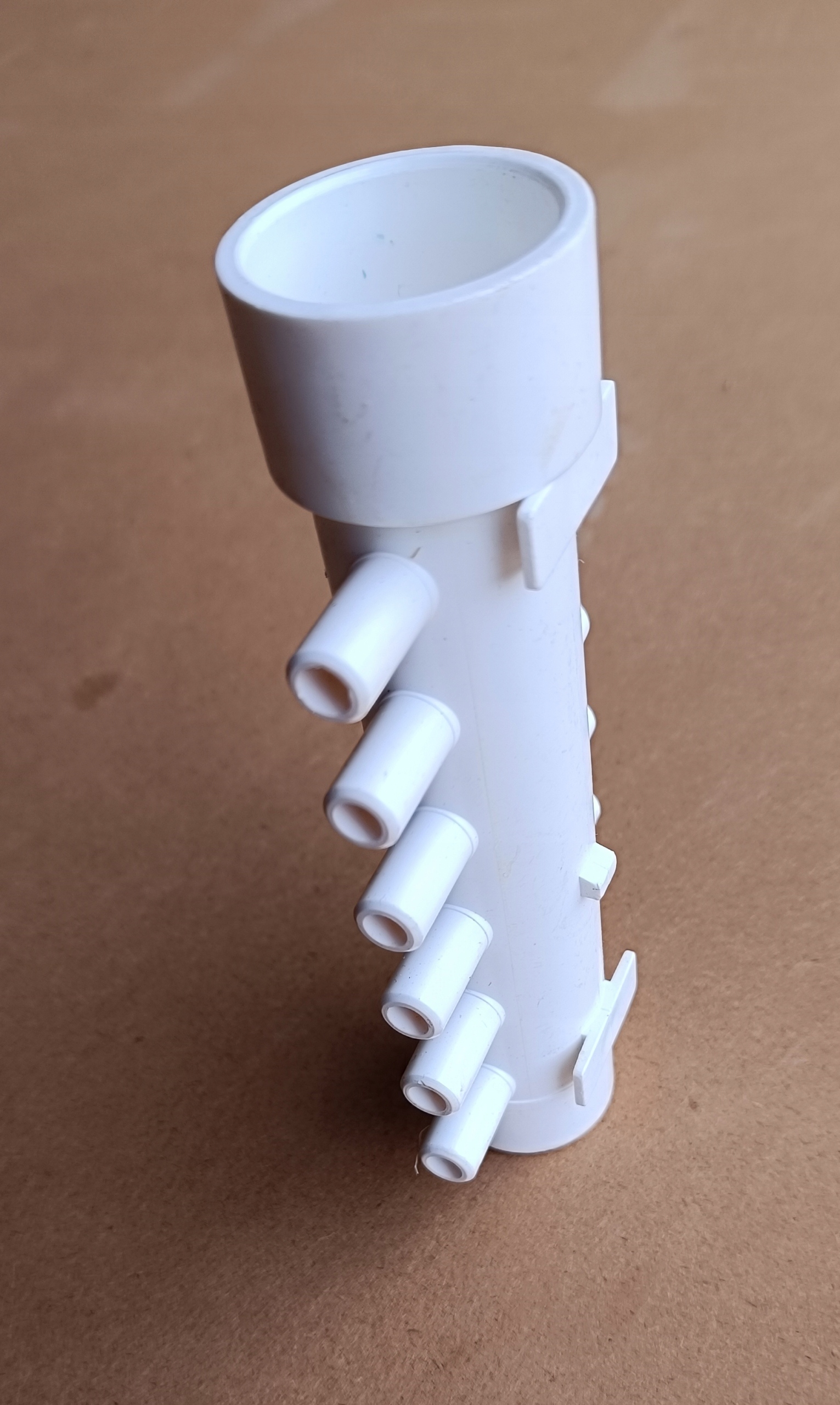 Rozdzielacze można swobodnie łączyć ze sobą, jeden wchodzi w drugi, w razie konieczności rozdzielenia powietrza z dmuchawy na 24 dysze potrzebne będą 2 rozdzielacze, które klei się klejem do PVC